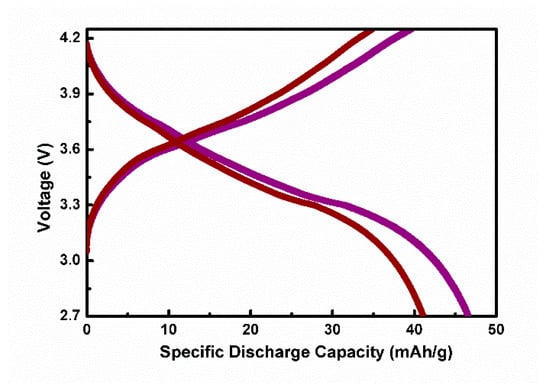 Before any further treatments, we tested the performance of the B-HT and P-02 samples as the cathode and graphite as the anode in a cylindrical battery (full cell). The charge–discharge curve is presented in Figure 3 with voltage range of 2.7–4.2 V. The first cycle was used for formation, and the coulombic efficiencies of B-HT and P-02 were 34.3% and 31.5%. The specific discharge capacities of B-HT and P-02 were too low compared to the theoretical capacity of NCA (200 mAh/g)—46.7 and 41.1 mAh/g at 4 mA/g, respectively. The P-02 capacity result corresponds to the XRD analysis which showed deterioration of the NCA structure after heat treatment. Although the XRD pattern of B-HT is quite good, it has poor specific capacity in battery performance. This may be caused by the washing effect of NCA after NaOH dissolution which leads to a reaction between NCA and water that forms nickel hydroxide and nickel oxide hydroxide on the NCA surface. The presence of nickel hydroxide and nickel oxide hydroxide on B-HT powder can affect the electrochemical properties and can block Li+ diffusion during de-lithiation/lithiation [53]. Also, the PVDF and AB on the B-HT samples act as inactive materials which can reduce the specific capacity (mAh/g). Therefore, such further treatment is necessary to enhance the electrochemical performance of NCA. In this work, acid leaching and mixed metal hydroxide co-precipitation were applied as further processing to the P-02 sample in order to recover valuable metals and resynthesize NCA material.