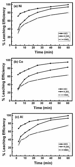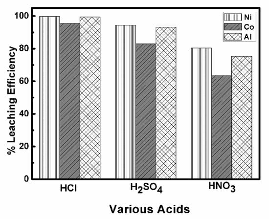Figure 4. shows the effect of various acids on the leaching efficiency for the P-02 sample at concentrations of 4 M by heating at 80 °C for 1 h. In the present study, HCl shows the highest rates of leaching efficiency for Ni and Co in this experiment, which agrees with the results of a previous study [21]. Clearly, HCl is more suitable for the leaching of metal ions from NCA material as it achieved a rate of leaching efficiency that surpassed 95% for all metal ions. The great performance of HCl in the leaching process was due to the Cl− ions in HCl; these showed high reactivity towards metals, resulting in a rapid attack on the metals [21,22].