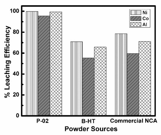 In order to ensure that the pretreatment process with heating produces high-efficiency metal extractions, Figure 5 shows a comparison of HCl leaching at an acid concentration of 4M, temperature of 80 °C, and leaching time of 60 min using the P-02 sample (after pretreatment with heating), B-HT (after pretreatment without heating), and commercial NCA. The results show that the leaching efficiencies of Ni, Co, and Al in B-HT were the lowest compared to P-02 and commercial NCA. The presence of PVDF and AB contained in B-HT may also be the reason for the poor leaching efficiency by inhibiting the diffusion of metals into solution. Therefore, the pretreatment process with heating provides a significant improvement in the leaching behavior of valuable metals under such conditions, e.g., high solid loading rate, short processing time, and absence of a reducing agent.