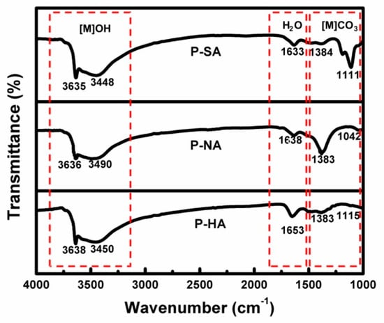 After the leaching process, the filtrate was precipitated using ammonia and NaOH as the monodentate ligand and precipitant agent, respectively. The greenish –OH precursors from the leachates of HCl, HNO3, and H2SO4 were obtained and denoted P-HA, P-NA, and P-SA. The functional groups of the –OH precursor were identified using Fourier Transformed Infrared Spectroscopy (FT-IR), shown in Figure 7. These results are in agreement with those of previous research on Ni(OH)2 nanoplates [55,56].