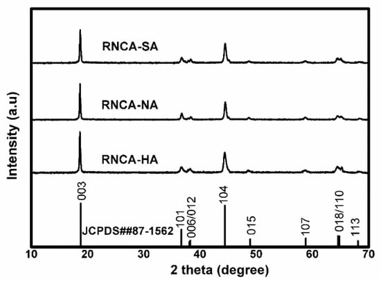 Next, the –OH precursors (P-HA, P-NA, P-SA) were processed to resynthesize NCA material which was mixed with LiOH (mol ratio = 1:1.03) and then calcined and sintered in a muffle furnace in order to obtain Recycled NCA material (denoted RNCA). The obtained RNCA types from various forms of –OH precursors (P-HA, P-NA, P-SA) were denoted RNCA-HA, RNCA-NA, and RNCA-SA. The structures of RNCA were characterized using XRD. Figure 8 shows the XRD patterns of RNCA-HA, RNCA-NA, and RNCA-NA, which revealed that all samples are similar and a good fit to JCPDS #87-1562. These results show that the RNCA crystal phase is α-NaFeO2 with a R3m space group. The explicit splits at I006/I012 and I018/I110 indicate the favorable hexagonal layered structure of RNCA.