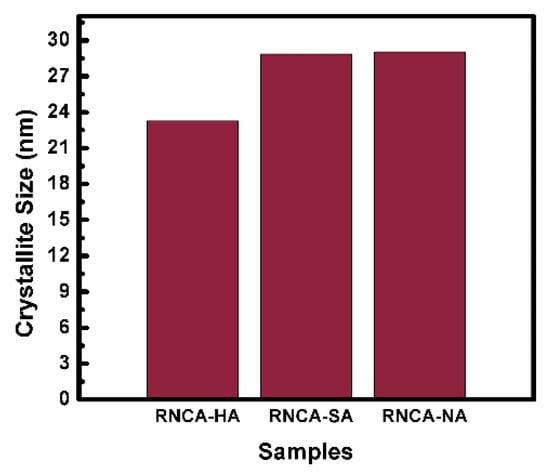 Figure 9 presents the crystallite size of all RNCA samples. From the figure, it can be seen that the crystallite sizes of RNCA-HA, RNCA-NA, and RNCA-SA were 23.27, 29.04, and 28.87 nm, respectively. It can be concluded that all of the RNCA samples had a small crystallite size.