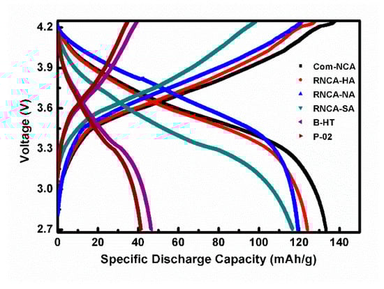 From the charge–discharge curve at 4 mA/g, the discharge capacities of Commercial NCA, RNCA-HA, RNCA-NA, and RNCA-SA are 133.40, 124.156, 119.570, and 116.567 mAh/g, respectively; the values for recycled NCA are slightly different to that of commercial NCA. The highest specific discharge capacity measured in the present study was obtained by RNCA-HA. This result corresponds to the XRD pattern of RNCA-HA which has the highest crystallinity, and this confirms that high crystallinity has a strong impact on the discharge capacity [59,62]. Compared with the P-02 and B-HT samples, resynthesis of RNCA via the hydrometallurgical route delivered better discharge capacities that were improved by more than 150% over that of heat treatment.