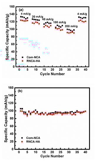 The results of ratability and cyclability tests on the RNCA-HA and commercial NCA are displayed in Figure 12. Ratability or rate performance was assessed by charging and discharging the battery cells at various rates. In this study, the battery cells were charged and discharged at 4, 20, 40, 100, and 200 mA/g. From the data in Figure 11, the results show that the specific capacities of RNCA-HA and Commercial NCA have similar ratability behaviors. The specific capacities of both samples slightly decrease from 4 to 200 mA/g; the capacity retentions at various rates are presented in Table 3. The capacity drops of RNCA-HA and commercial NCA from 4 to 200 mA/g are 27.4% and 25.2%, which are only slightly different. From the data in Table 3, the RNCA-HA has a larger capacity drop than commercial NCA, which may be caused by the large amount of aggregation of primary particles that formed in RNCA-HA. Based on the SEM images, some primary particles did not agglomerate into larger secondary particles. Loose submicron primary particles have a larger surface area and are reactive with electrolytes during the charge–discharge process, which could lead to side reactions forming a passivation surface [46,65,66] and cause a defect in the electrochemical performance. After being cycled at 200 mA/g, the cells were charged and discharged at 4 mA/g five times to prove the reversibility of Li-ion insertion and de-insertion. A slight capacity drop was observed in each sample. Overall, each battery was stable or exhibited a small capacity decrease from the 4 to 200 mA/g. Also, RNCA-HA showed a higher retention of capacity (96%) after 40 cycles at 100 mA/g than commercial NCA (93.4%) in a cycling test. It was confirmed that the high crystallinity of RNCA-HA influences the stability in electrochemical performance [59,62]. Both samples have high coulombic efficiencies of over 99%. Clearly, the electrochemical performance of RNCA-HA is comparable with that of commercial NCA in full cell testing.