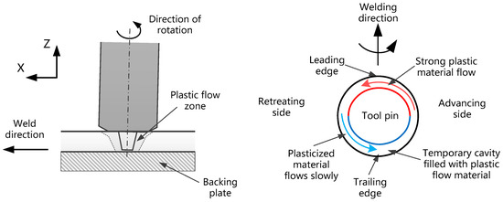 In FSW, there is a close contact between the tool and the material to be welded, so there is severe friction between the tool and the workpiece. During the welding process, the intense friction between the tool and the workpiece generates a large amount of heat. This heat causes the temperature of the material to rise, and the material softens at high temperatures [10,11,12]. The softened material undergoes severe plastic flow under the drive of the tool. At the same time, the shear deformation of the material also generates a part of the heat [13]. Along with the plastic flow of the material at a high temperature, the heat transfer inside the material is convective and conductive. The severe plastic flow of the material under the drive of external force causes heat convection, and the temperature distribution also affects the plastic flow of the material [14,15].