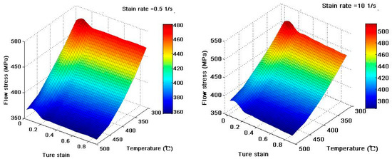 A proper selection of material models is critical to an accurate solution in the simulation process. The material changes from a solid state to a viscous state, so it is necessary to define a wide range of strain, strain rate and flow stress values at temperatures. The flow stress is defined as a function of the strain, strain rate, and temperature, and Equation (16) is used to define the flow stress:
