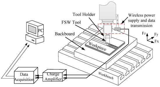 The axial force and torque in the welding process are collected by electromagnetic coupling technology, and wireless power transmission is adopted, as shown in Figure 5. Most scholars use the method of setting the mechanical sensor at the bottom of the workpiece for data acquisition. However, since the measurable area of the sensor is limited, when the welding center deviates from the center of the sensor, the accuracy of the test method will be greatly reduced; thus, it is difficult to track and collect long welds.