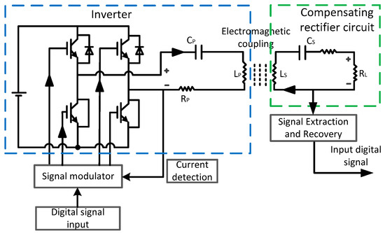 In the magnetic coupling resonant radio energy and signal transmission system, the primary side uses the amplitude shift keying (ASK) method to load the signal into the power transmission channel for a synchronous transmission, and uses the non-coherent demodulation method to extract and recover the signal on the secondary side. The schematic diagram of the acquisition method is shown in Figure 6. The power and signal synchronous transmission method can reduce the inverter link, reduce the loss and improve the quality of the advancing signal transmission.