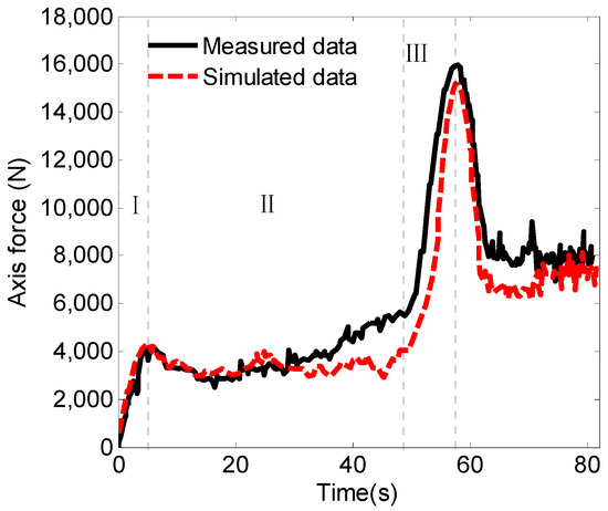 The axial force was tested throughout the FSW process. Figure 7 shows the comparison of the test results with the simulation results. It can be seen from the curve that the temperature gradually rises and reaches a peak in the first phase of the curve. In other words, the tool pin is just in contact with the workpiece, and some of the material is extruded due to plastic shear. The temperature rise softens the base material around the tool pin and promotes the pressing down of the tool. The material around the second stage tool gradually softens, and the external force of the tool plunged into the material increases slowly. In the third stage, as the tool shoulder comes into contact with the extruded material, the axial force begins to gradually increase, mainly due to the need for a greater axial force due to the tool shoulder squeezing the spilled material. At the peak of the axial force, the tool is prone to wear. Fracture can easily occur under extreme conditions. However, the axial force of the simulation output is slightly lower than the actual test results, but the overall trend of each step is in good agreement.