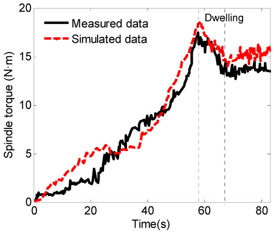 The spindle torque gives important information about the power consumption of the welding process, so torque is a decisive factor in the power requirements of the friction stir welding robot spindle. The change in the torque curve is gradual compared to the axial force, and the torque curve and the axial force curve have similar trends. As shown in Figure 8, the torque of the tool is relatively small at the beginning of the plunging. As the contact area between the tool pin and the material increases, the spindle torque also increases. During the dwelling phase of the tool, the torque is gradually reduced, and the torque variation during the welding phase is relatively flat. The simulated data and the experimental data have certain errors, and the simulated curve changes relatively gently during the plunging phase, but the overall values and trends are close to the experimental data, thus verifying that the finite element model is relatively accurate.