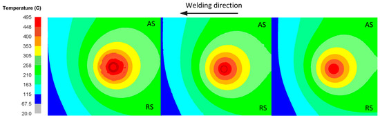 The simulation of the temperature field has a certain significance for the study of the friction stir welding process. The friction stir welding process is also the result of the joint action of the tool shoulder and the tool pin. The temperature field in the welding area is analyzed in three layers, in which the upper layer is the surface layer, the middle layer is 3.5 mm deep below the surface layer, and the bottom layer is the bottom surface of the workpiece. As shown in Figure 9, the temperature field in the surface layer presents the highest temperature, and one can observe that the temperature on the advancing side is significantly higher than that on the retreating side. The temperature on the advancing side is about 20 °C higher than that on the retreating side near the welding seam; furthermore, the experimental test can be referred to [26].