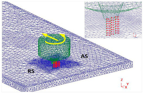The geometric model of the friction stir welding is shown in Figure 3. To make the simulation results more accurate, three sets of meshes are added to the workpiece weld area, and the minimum mesh is divided into 0.6 mm. Because the pin participates in the material flow of the welding process, the tool plays an important role in the flow of the material. However, considering the solution duration, the mesh size of the tool shoulder and the welding influence area are gradually increased, which ensures the calculation accuracy and improves the calculation efficiency [31]. A set of mesh window is also set on the tool, and the mesh window is set to move synchronously with the tool during the welding process.