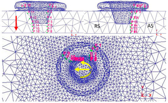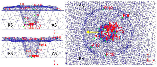 Before the tool pin is not plunged, as shown in Figure 10, three sets of tracking particles are arranged inside the tool pin, where P1–P8 particles are arranged in the center area of the tool pin, P1 is set on the surface of the workpiece, and the minimum diameter of the tool pin end is 4.6 mm. P9–P16 is set in the retreating side area 2 mm away from the axis, and the rest, P17–P24, is set in the symmetrical advancing side area. Where the plunging direction is the negative direction of the Z-axis, the spindle does a rotation movement around the Z axis, and the welding direction is the negative direction of the X-axis. Therefore, the top view, front view and side view are the positive Z direction, positive X direction and negative Y direction, respectively.