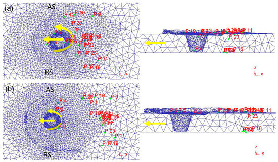 Figure 17a,b shows that the material flows under the action of the tool pin, whereas the material flow velocity on the retreating side is less than the advancing side, which also results in less material accumulating on the advancing side, which confirms the results of the literature [39].The trajectory of the marker material particles on the return side has two main parts. A part of the material is rotated around the tool pin for about half a week and then deposited onto the area near the advancing side of the tool. The other part of the material hardly rotates around the tool pin, but is gradually pushed down by the tool onto the area between the center line and the retreating side of the rear weld. A small number of particles on the tool shoulder is deposited in front of the retreating side after rotating around the tool for several weeks.