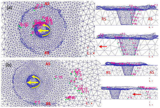 Two sets of tracking particles are arranged on the retreating side, and the position is symmetrical to the advancing side. P1–P8 is close to the leading edge of the tool, and P9–P16 is close to the trailing edge of the tool. Since the rotation direction of the tool is counterclockwise, the particles in the initial stage of pressing extend outward under the extrusion action of the tool pin, as shown in Figure 16. As the pressing temperature gradually increases, the plastic softening layer in the weld zone becomes thicker, and the material plastically flows. The particles in the P1 group move backwards to the rear of the weld with the rotation of the tool pin.