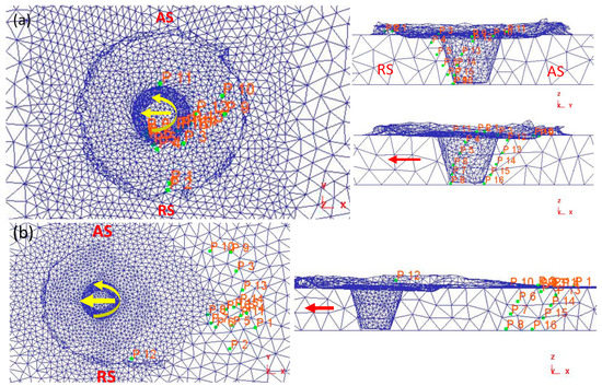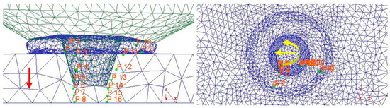 The tracking particles are arranged on the advancing side of the welding area. In order to improve the comprehensiveness of the simulation analysis, two sets of tracking particles (P1–P8 and P9–P16) are set. The distance from the axis of the tool pin is 3 mm, and the two groups of tracking particles are symmetrically distributed, as shown in Figure 13. It can be seen from the side view that they are located on both sides of the center line of the tool pin.