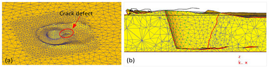 The formation of hole defects is mainly due to insufficient heat input in the welding process, insufficient materials reaching the plastic softening state and an insufficient material flow, resulting in an incomplete closure in the welding interior [40]. When the spindle speed is low or the welding speed is too fast, the joint is prone to holes and crack defects. This type of weld defect is usually located in the middle and lower parts of the advancing side and near the weld surface. In the simulation process, the holes that were found after the welding speed increased by 2 times were formed in the lower parts of the advancing side, as shown in Figure 18b. When the rotation speed of the main shaft is further reduced by 0.5 times, a crack defect occurs after the welding, as shown in Figure 18a.