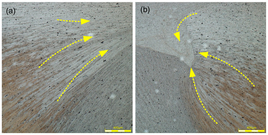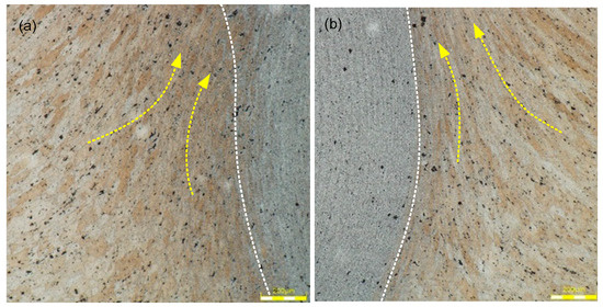 Due to the different material flows and microstructures in each region of the joint, the WNZ of the material forms a clear boundary with the TMAZ, and the material flow direction can be clearly seen from the formation of the microstructure in the TMAZ. As shown in Figure 20b, the microstructure in the WNZ is composed of fine recrystallized grains due to the intense stirring action of the pin. At the same time, it can be observed that the material in the TMAZ also has a plastic flow. The material under TMAZ near WAZ is rotated by the tool pin, and the material has an upward flow trend. Some of the material is squeezed into the WNZ, which is also found in the simulation. The material in TMAZ far away from the WNZ tends to move obliquely upward, and shows a similar rule on the advancing side, as shown in Figure 20a. However, it can be observed that the material flow slope on the advancing side is larger, which also confirms that the material flow on the advancing side is more intense.