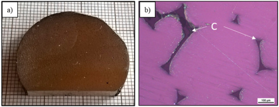 (a) Macrograph and (b) LM micrograph of Cof–Mg composite obtained by pressure infiltration.