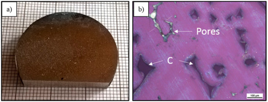 (a) Macrograph and (b) LM micrograph of Cof–RZ5 composite obtained by pressure infiltration.