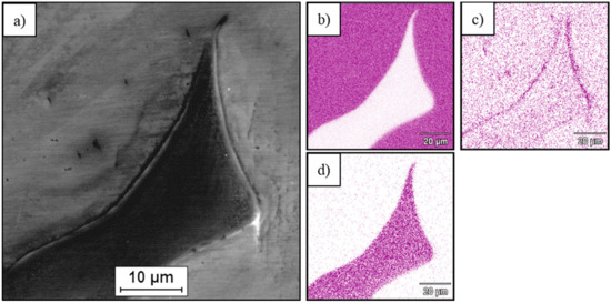 At the surface of the Cof–AZ31 composite (Figure 13c), the shallow grooves in the matrix were formed after dry friction. Moreover, the initial foam geometry and continuous bonding foam-matrix alloy were preserved. The analyses of carbon component surface morphology revealed its foam degradation process via crumbling of fine pieces and the effect of wear product agglomeration at the foam edges. When the AZ31 alloy was examined, it exhibited grooves, cracks and delamination effect at the wear surface (Figure 13d). When we compared these obtained results of the Cof–AZ31 composite tribological tests with earlier studies that were focused on magnesium alloys and composites with particle and short carbon fiber reinforcement [12,14,38], we did not notice the expected effect of properties improvement in the dry friction condition, which requires further analysis. At this stage of our study, we can assume that the formation of a solid tribofilm with carbon molecules is much more difficult when the source of carbon is a stiff skeleton (Cof) that is strongly bonded to the metal matrix.