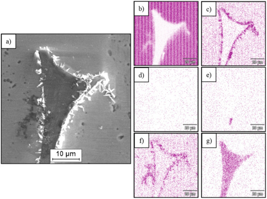 (a) SEM micrograph of Cof–AZ31 composite with X-ray mapping of elements: (b) Mg, (c) Al, (d) Zn, (e) Mn, (f) O and (g) C.