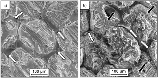 SEM micrographs of fractured surface after flexural tests: (a) Cof–Mg, (b) Cof–AZ31, shear bands in magnesium matrix, network of partly destroyed carbon foam (white arrows), agglomerates of fine phases (black arrows).