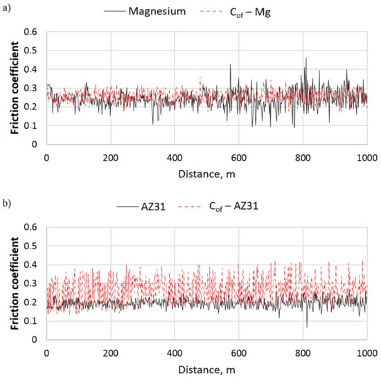Changes of friction coefficient determined for composites and reference matrix alloys over a distance of 1000 m, (a) magnesium and Cof–Mg, (b) AZ31 alloy and Cof–AZ31.