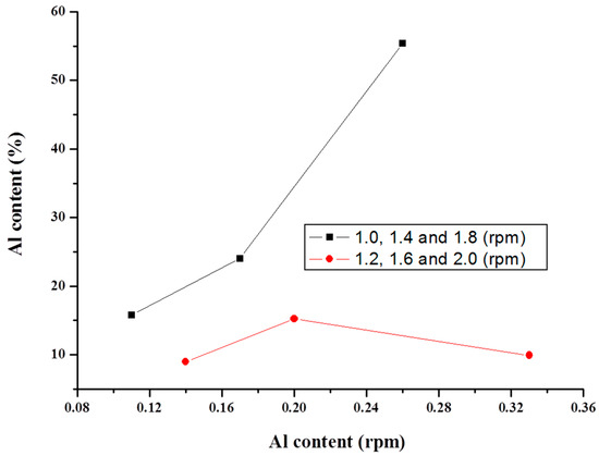 The microstructures and Al content (at.%) of the as-built Ti–Al samples are reported in Table 3 and Figure 5, respectively. Al content in the as-built sample supposedly had to increase linearly with the increase in set rpm, but the EDS measurements proved otherwise. The Al content in the as-built samples varied considerably, as reported in Table 3.