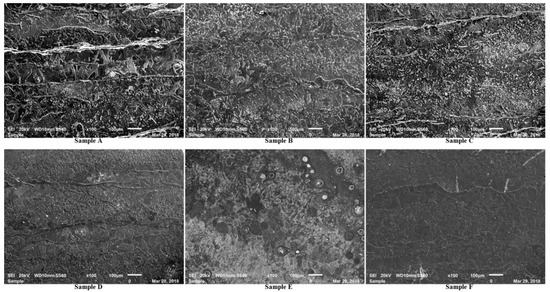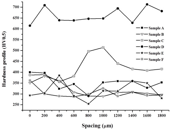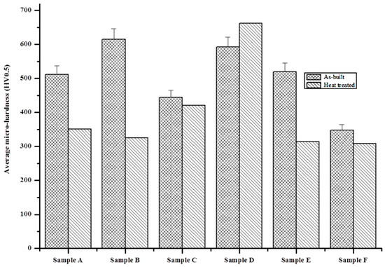 Hardness curves reported in Figure 9 conclude that Sample D was hardest with fewer points rising above the homogeneity line, which can be imagined to be around 620 HV. Similar observations can be made for sample C, which was also hard. Samples A and E were wavy, while samples B and F were stable. These two samples can be interpreted as homogeneous. The overall hardness values (HV) for the samples after heat treatment were 351 ± 25.6, 325 ± 30.75, 420 ± 22.2, 662 ± 29.6, 314 ± 25.95, and 308 ± 17.35 for samples A–F. These hardness values were compared to the as-built samples as shown in Figure 10 (bar-diagram).