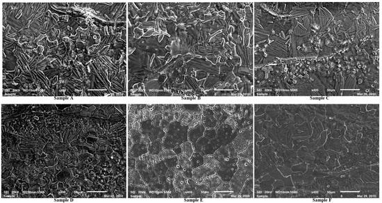 The microstructures of the as-built samples, as reported in Figure 6, look to be heterogeneous and had visible bands/layers. Sample E shows partially melted powder particles. The samples are also characterized by fine microstructure and agglomerated lamellar or lamellar laths (samples A, B, and C), lamellae grains (samples D and F), and formed grains (sample E). Liu et al. [41] observed coarsening in the lamellar laths, while here the laths grew small and refined into grains with the increase in Al. The features in microstructures are resolved in the SEM images that are reported in Figure 7.