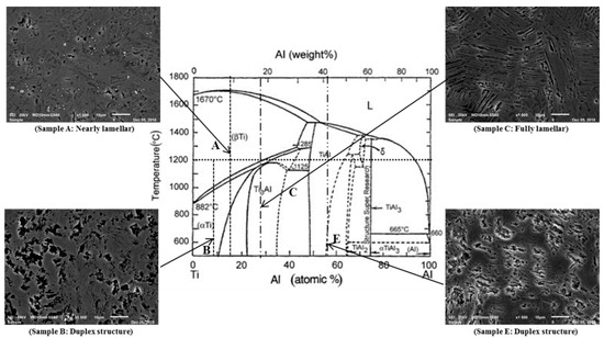Post-manufacturing, the samples were cut and prepared for metallographic observation in the as-built and post-heat treatment states. Heat treatment was performed on the samples for stress relief, microstructural homogenization, and phase precipitation. It is well established that the as-built samples have internal residual stress and that elemental segregation during alloying would lead to a heterogeneous microstructure. The phase precipitation was attained in accordance with the binary Ti–Al phase diagram (Figure 2).