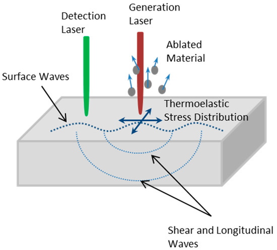 An implementation of non-contact potentially in process ultrasonic testing can use lasers to generate and detect ultrasonic waves [100]. This inspection method can be used for a wide bandwidth of frequencies, up to 15 MHz. There are multiple setups for these systems, and a typical layout of laser ultrasound inspection configuration can be seen in Figure 9.