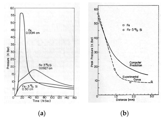 Figure 3b shows that the predicted surface pressure was close to the experimental pressure. The attenuation of the peak pressure appears to be largely hydrodynamic through the first 0.5–0.6 mm in depth. Beyond this, the attenuation is faster than the hydrodynamic code predicts due to microstructure-related damping effects such as plastic deformation. Lastly, beyond 2 mm the wave is elastic and only weakly attenuated. It should be noted that all pressure measurements using a thin metal foil, vapor deposited film or black paint on a quartz gauge is the pressure developed in the quartz [