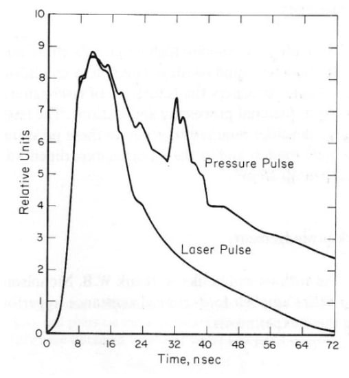 It was also important during this early stage to understand the temporal relationship between the laser pulse and the pressure pulse. A direct comparison of a set of laser and pressure pulse profiles from the same shot is shown in