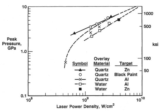 18]. In addition, he also investigated the overlays’ effects on the peak pressure at the back surface of 1 mm-thick 6061-T6 aluminum coupons. The peak pressure increased as the surface condition was varied between bare, paint only, water only, and water plus paint. At the same time, Yang reported on an extensive study to determine the sensitivity of the peak pressure generated by a confined plasma to target composition, target thickness, and energy density [