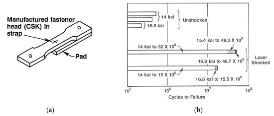 29]. This specimen paired a tensile specimen and rectangular pad of 7075-T6 aluminum fastened together with a steel aerospace quality aircraft fastener through a hole in the pad and the gauge length of the tensile specimen. The difference in the cross-sectional areas of the pad and tensile specimen caused a 30% load transfer, creating a cyclic fretting strain differential between the two pieces at the fastener hole. Laser shocking was simultaneously applied to both sides of the fastener hole of the fatigue specimen with a 13 mm-diameter spot centered on the hole. The tensile fretting fatigue results are shown in