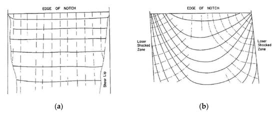 Figure 13 as maps of the progression of the crack front. In the unshocked condition, the crack opens along the entire height of the hole before propagating away from the hole with a straight front. In the shocked condition the crack initiates on the hole surface at mid-thickness of the sheet, followed by tunneling between the compressive surface stresses until it is beyond the laser shocked area. While tunneling it is not visible on the surface and when the ends of the crack do break through to the surface, the compressive stress clamps it closed, making it very difficult to detect. By the time the crack is detected outside the laser shocked spot, it is already many millimeters long, and rapidly propagates to failure. Not being able to see a propagating crack concerned the Air Force.