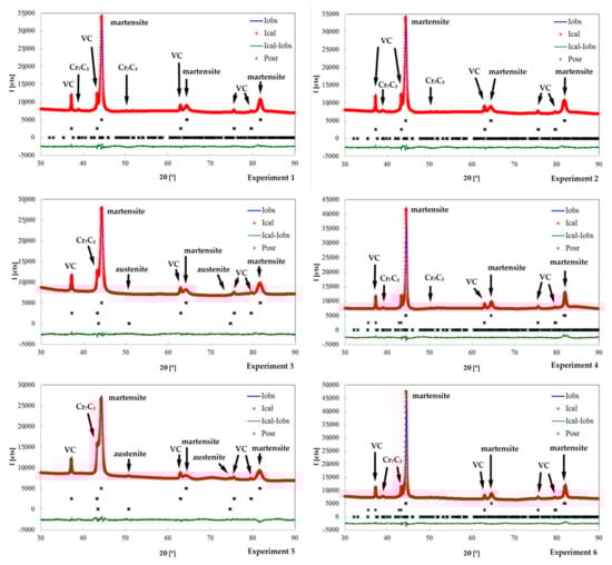 Figure 2 shows the diffractograms for the eight experiments, obtained by X-ray diffraction (XRD). Figure 3 shows the adjustment using Rietveld structural refinement method. Table 4 shows the weight percentages and the lattice parameters of the main crystalline phases detected by XRD in each of the eight experiments. Note that the majority phase in all the experiments is martensite and that the main carbides detected are VC and Cr7C3. It should also be noted that the presence of retained austenite was only detected in Experiments 3, 5 and 7.