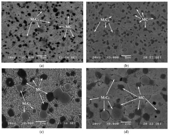 Secondary electron images (SEI) of: (a) microstructure corresponding to Experiment 2; (b) microstructure corresponding to Experiment 5; (c) microstructural details of Experiment 2 observed at a higher magnification; (d) microstructural details of Experiment 5 seen at a higher magnification. It can be seen that the sample corresponding to Experiment 2 has a higher density of secondary carbides. Images were obtained by scanning electron microscope (SEM).