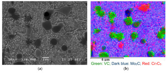 Distribution of carbides in the sample corresponding to Experiment 2. A single particle of Mo2C can be observed. Based on the reddish coloration in the matrix, it would appear that the majority of the precipitated secondary carbides are of the Cr7C3 type. (a) Scanning electron microscopy (SEM) image. (b) Mapping of elements by means of energy dispersive X-ray (EDX) microanalysis.
