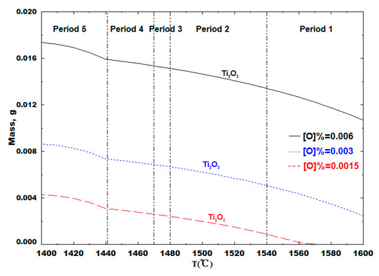 Figure 4 illustrates the evolution of inclusions as a function temperature at different production temperatures (Table 2) during the industrial process. As the steel cools, Ti2O3 starts to form at 1600 °C as the sole oxide inclusion under the equilibrium condition with [O%] ≥ 0.002. We have previously examined the precipitation of TiN over the full duration of the casting sequence [23]. TiN was found to be one of the primary inclusions, with more than 80 wt. % TiN being precipitated before Period 3 (in the ladle and tundish). If countermeasures, such as a gas curtain and moderate argon injection into the nozzle before the SEN, are adopted, then the TiN inclusions are excluded and anti-oxidized, which significantly minimizes the detrimental effects [24].