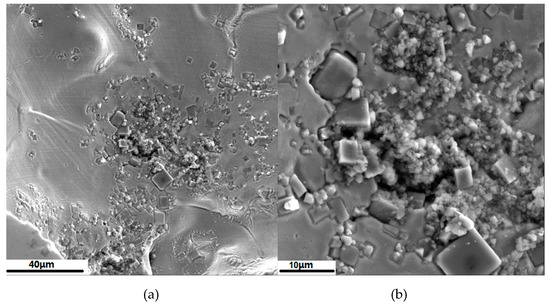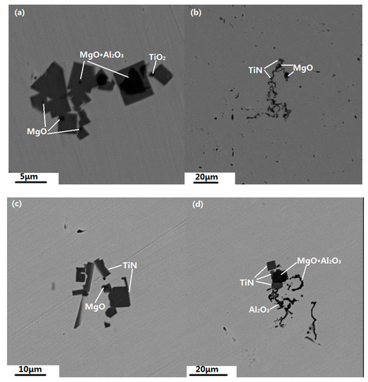 Figure 5 shows the typical SEM images of TiN clusters that were observed in the gas holes within the floaters. The size of cube-shaped TiN particles ranged from 1 to 10 μm. The difference in the average number density of TiN within the floaters and the 321 steel were determined by examining 15 different SEM images; Figure 6 presents the typical images. The inclusions in all samples examined were highly heterogeneous. The average number density of TiN in the floaters was estimated to be as much as 1.7 times greater than that in the 321 steel. In addition, the TiN clusters in floaters (2–6 μm) were larger than those in 321 steel (1–4 μm), which suggested that the formation of TiN in the floaters is the solubility that produced inclusions forming in the ladle process. Additionally, a range of nonmetallic inclusions acted as potential nuclei for TiN (Figure 7a,c). Independent of the inclusion category, magnesium oxide and spinel (MgO-Al2O3) were found in most of the investigated nuclei; oxides are partially combined with CaO, also sporadically with TiO2. Wavy and irregularly shaped inclusions that had high amounts of MgO, TiN, and traces of TiOx were observed in the 321 steel and the floater, as shown in Figure 7b,d.