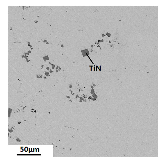 The effects of TiN inclusions on the nucleation of δ-Fe were investigated by examining both the properties of the TiN inclusions and the composition of the floater that was collected from the verification experiment. SEM-EDS analysis showed that the TiN in the floater from the verification experiment was more concentrated and larger than that in the floater from the 321 steel heat, because the TiN was added during the experiment (Figure 9). The composition of the metallic phase (83.28% Fe, 4.76% Cr, 11.96% Ni) that is shown in Figure 9 had a slightly higher percentage of Fe, but lower percentages of Cr and Ni when compared with the composition of floater collected from 321 steel heat. Therefore, the dominant factor that determined the composition of floaters was likely the nucleation of δ-Fe on the TiN inclusions. The difference in the composition of floater and 321 steel was attributed to the preferential nucleation of δ-Fe on TiN and MgO or MgO·Al2O3 inclusions that starts as soon as the melt temperature drops below the liquidus temperature. TiN inclusion, as the most major inclusion in 321 steel, will bring about an evident increase in the iron content due to the preferential nucleation of δ-Fe. The nickel that can act as the austenizer in 321 steel sharply decreased, while the chromium inconspicuously decreased, owing to the overwhelming increase in iron content, despite chromium being able to promote the formation of δ-Fe.