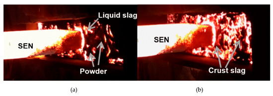 Condition of the mold slag in field test. (a) Early period; and, (b) ten minutes after the start of casting.