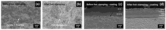 To analyze the martensitic phases, all specimens were etched in a Nital solution. Micrographs of the hot-stamped steels are shown in Figure 2 before and after the hot stamping procedure. As shown in Figure 2, the as-received initial cold-rolled blanks had a pearlitic-ferritic dual phase before the hot stamping procedure. In the furnace, the microstructure had an austenitic phase. The final automotive parts had a fully martensitic microstructure with a grade of 1800 MPa, and the Al–Si coating was fully transformed into Fex–Aly–(Si) compounds after hot stamping as shown in the Figure 3c,d. Table 2 lists the original mechanical properties with a typical tensile test in a specimen worked from the 300 × 300 sheet plates. The final specimens had a fully martensitic microstructure with a grade of 1800 MPa and an elongation with a value of about 8 El.%.