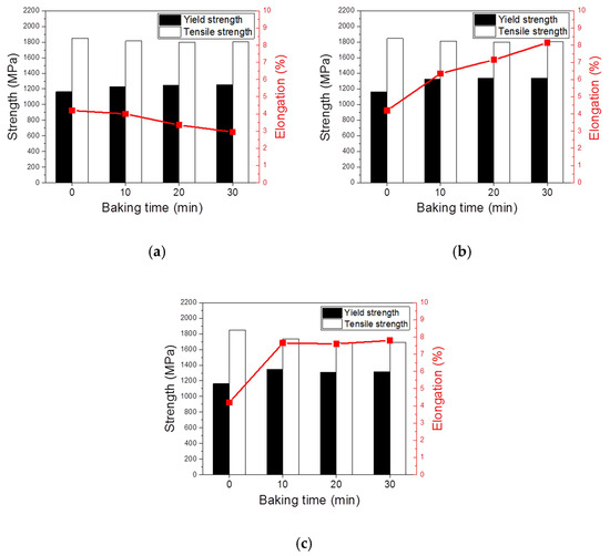 On the other hand, the BH150 conditions exhibited a proportional increase of reduction in elongation with similar tensile strength as shown in Figure 3b. In the case of the yield strength, the increase in this value occurred after baking for 10 min, but it maintained similar values as the baking time increased. In particular, as shown in Figure 3c, the BH200 conditions showed the most effective impact on the recovery of elongation with a short baking time of 10 min. The figure shows the original elongation in all conditions from 10 min to 30 min for the BH200 conditions. The yield strength increased with the same behavior shown in BH150 specimen, but there was some reduction in the ultimate tensile strength under the target value of 1800 MPa after baking for all specimens.