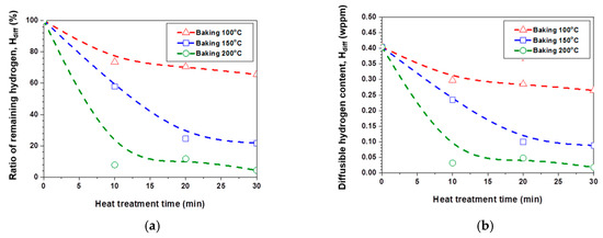 Diffusible hydrogen behavior on baking conditions: (a) Diffusible hydrogen concentration estimated using TDS at 300 °C and (b) ratio of remaining diffusible hydrogen.