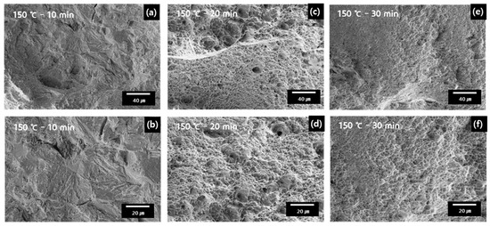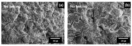 Meanwhile, the BH150 specimens show a threshold baking time in the ductile-to-brittle transition depending on the increase in baking time, as shown in Figure 8. The BH150 specimen at 10 min shows a still-brittle region in the fracture surface, as shown in Figure 8a,b. It appears that the remaining diffusible hydrogen plays a role in the embrittlement in this range of hydrogen concentration. However, in the BH150 specimen at 20 min, a transition of fractography was observed with mainly ductile fractures and microvoid ductile occurrences even though the remaining hydrogen existed at about 20%, as shown in Figure 8c. This indicates a mixed mode of microvoid coalescence, with several large flat regions connected to small areas of small ductile dimples, as shown in Figure 8d.