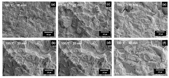 Fractography of SSRT specimens after tensile test of BH100 specimens after hot stamping and baking process: (a) Brittle section of fracture surface and (b) enlarged section in BH100 at 10 min, (c) brittle section of fracture surface and (d) enlarged section in BH100 at 20 min, and (e) brittle section of fracture surface and (f) enlarged section in BH100 at 30 min.